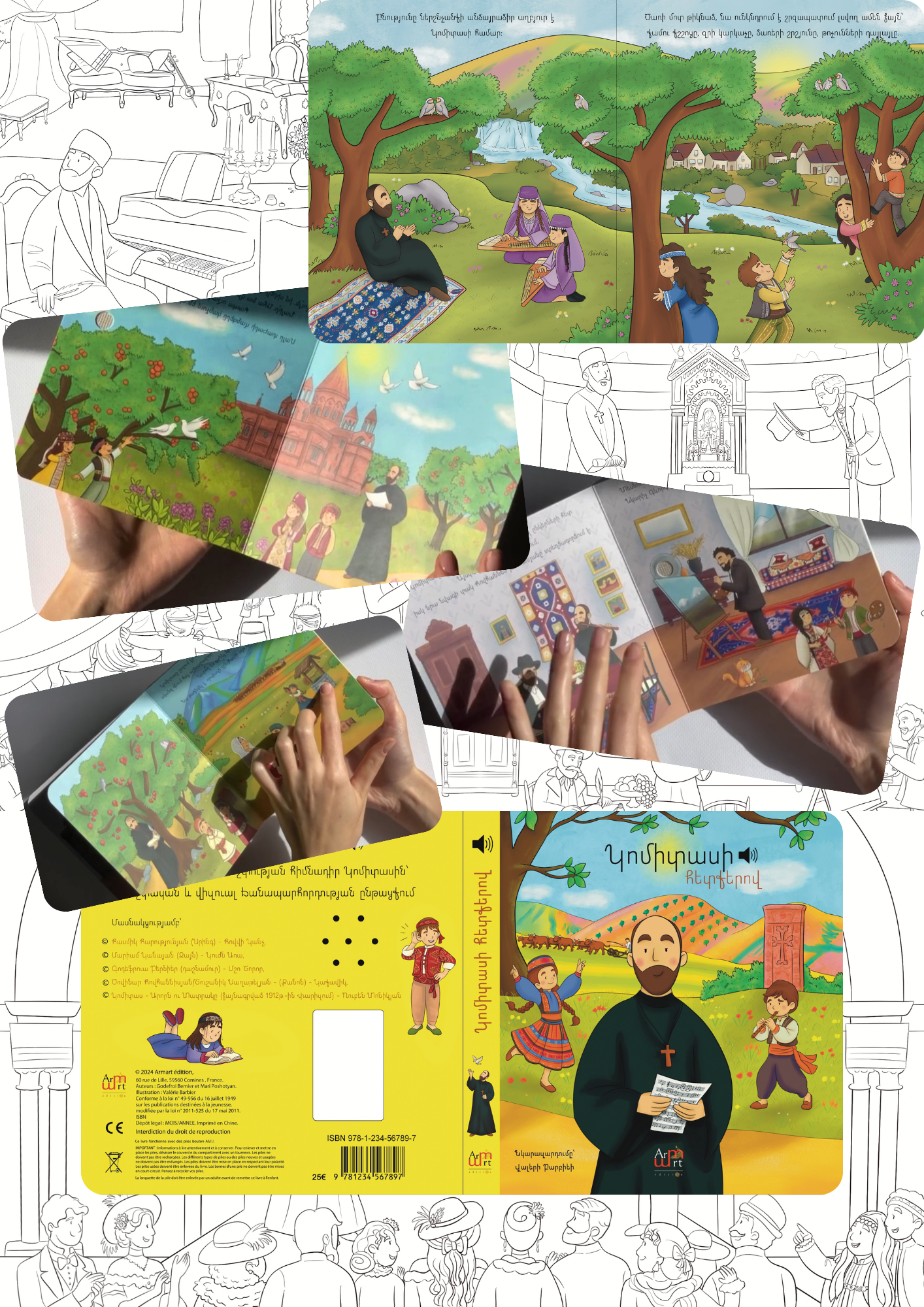 Les illustrations pour les livres sonores d’Armart Edition sont conçues avec une attention méticuleuse aux petits détails et aux couleurs vives, mettant en lumière la richesse des décors et la beauté des vêtements arméniens. Chaque illustration célèbre ainsi cette culture avec amour et fierté. Les traits des personnages sont délibérément simplifiés, ornés de petits yeux en forme de point, créant un style ludique et enchanteur, parfaitement adapté pour émerveiller les plus jeunes enfants. Cette approche artistique permet non seulement d’attirer l’attention des enfants, mais aussi de leur offrir une expérience immersive, les plongeant dans un monde rempli de traditions et de symboles qui éveillent leur curiosité et leur imagination tout en leur apprenant l’importance de leur héritage.