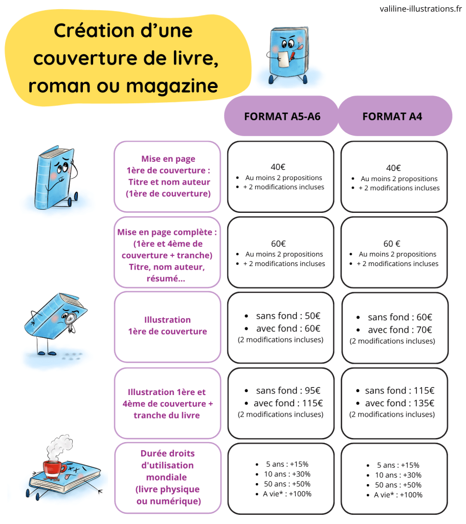 Exemple 2 : Un particulier souhaite illustrer son livre jeunesse (tranche d’âge de 3 à 6 ans) qu’il publiera en auto-édition au format de 20x20cm. Il souhaite 5 illustrations avec fond et 5 illustrations sans fond. Il souhaite aussi une illustration avec fond pour la 1ère et la 4ème de couverture Il choisi la durée d’exploitation de 5 ans.