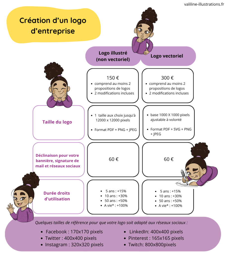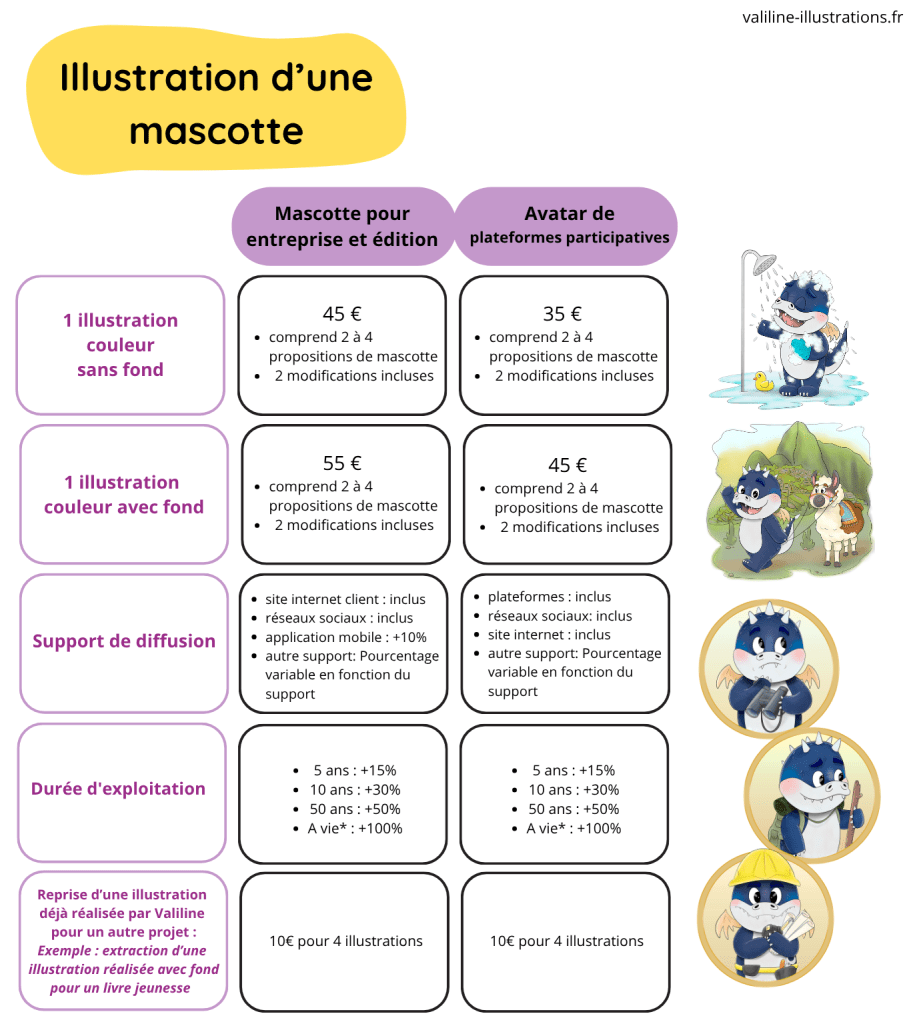 Exemple 1 : Une PME souhaite faire illustrer la mascotte de son entreprise pour décorer son site internet. Elle souhaite avoir 6 illustrations de cette mascotte dans des positions différentes. Elle choisit des illustrations couleur sans fond. Elle ne souhaite pas se servir de ces illustrations sur d’autres supports. Elle choisit la durée d’exploitation de 5 ans.